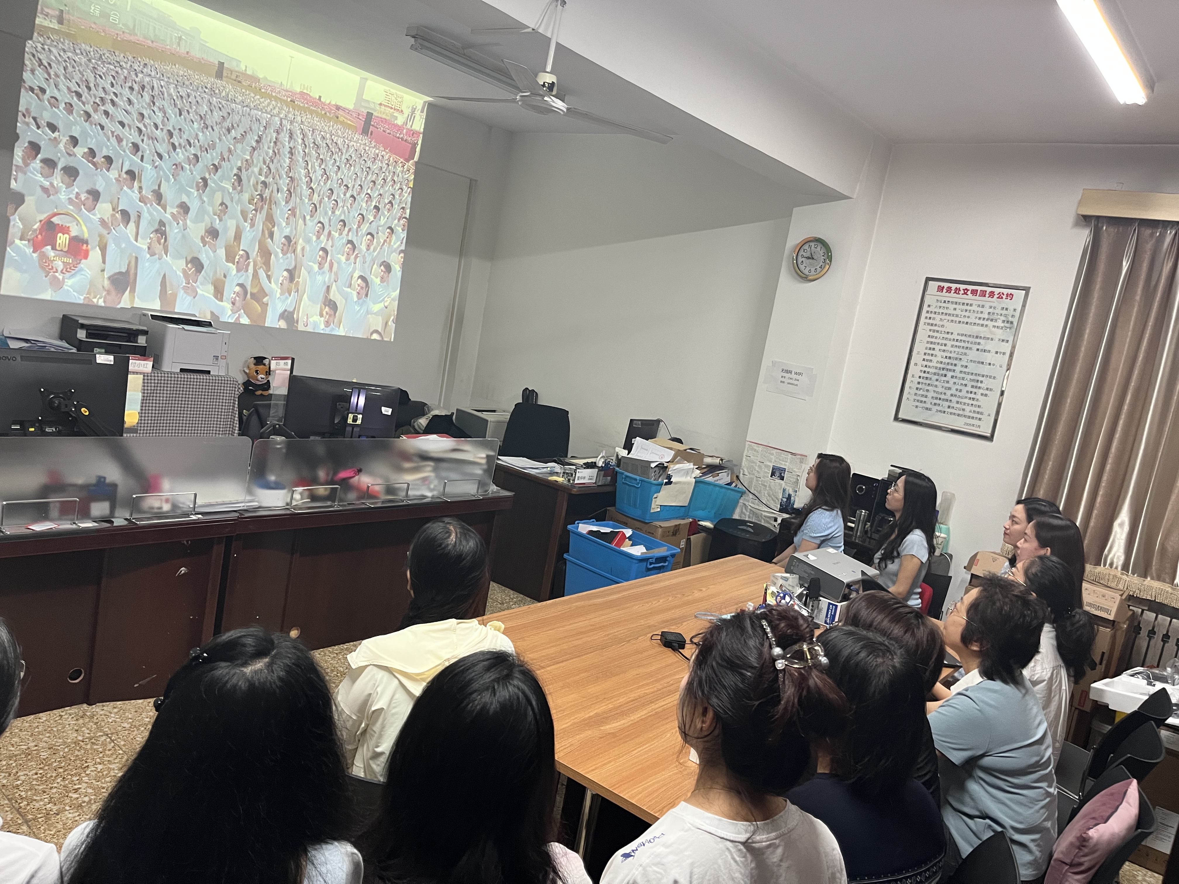 为不影响学校财务工作的正常运转,财务处采取了集中观看与岗位值守相结合的方式。上午9时,财务处工作人员完成各项紧急业务处理,随后齐聚综合科,集体收看阅兵仪式。